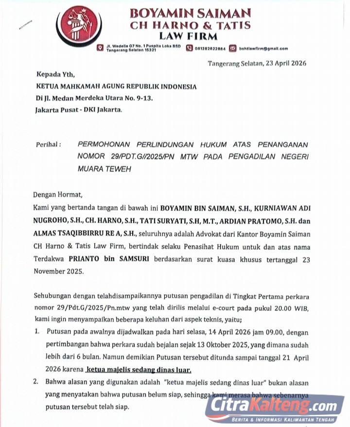 TANGERANG SELATAN, CITRAKALTENG.COM – Penasihat hukum dari Kantor Hukum Boyamin Saiman CH Harno & Tatis mengirimkan surat permohonan perlindungan hukum kepada Ketua Mahkamah Agung Republik Indonesia. Surat ini berkaitan dengan penanganan perkara nomor 29/Pdt.G/2025/PN MTW di Pengadilan Negeri Muara Teweh yang dinilai memiliki sejumlah kejanggalan dari sisi teknis prosedur.